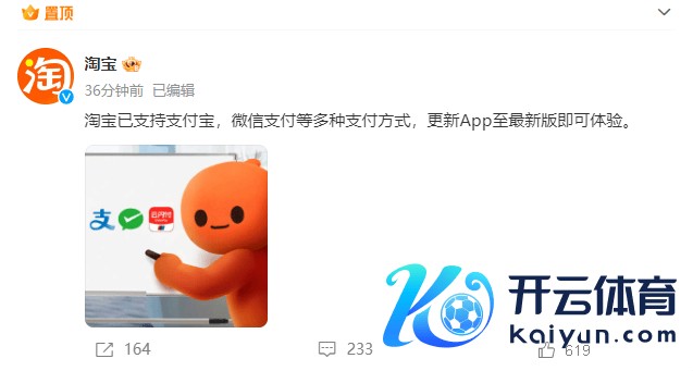 9月27日,淘宝官方文告,淘宝平台照旧救助包括支付宝和微信支付在内的多种支付步地,用户只需将App更新至最新版即可体验到这一新的支付功能 。