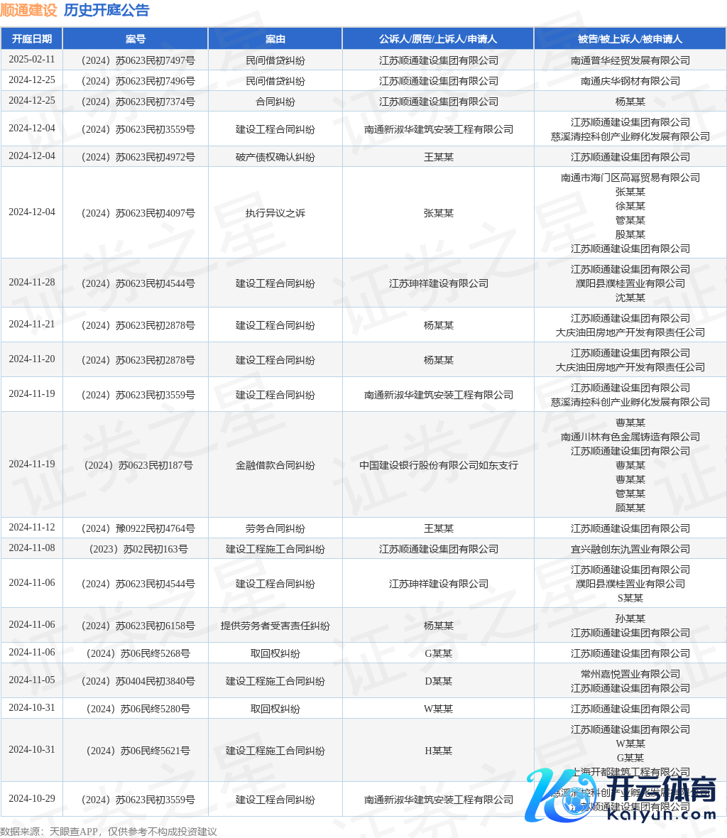 案号:(2024)苏0623民初4972号审理法院:如东县东说念主民法院案由:收歇债权阐述纠纷当事东说念主信息: 原告/上诉东说念主:王某某 被告/被上诉东说念主:江苏顺通树立集团有限公司开庭日历:2024年12月4日把柄统计,近一年内以江苏顺通树立集团有限公司为当事东说念主的历史开庭公告有124则,其中案由为“树立工程施工公约纠纷”的公告以21则居首,其次为“树立工程公约纠纷”有19则,“民间假贷纠纷”有12则。历史开庭公告(前20条)如下: