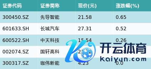 截止收盘九游体育官网登录入口,固态电板主题涨跌幅最高的五只股票为:先导智能(300450.SZ)、长城汽车(601633.SH)、中天科技(600522.SH)、国轩高科(002074.SZ)与珈伟新能(300317.SZ)。细目见下表: