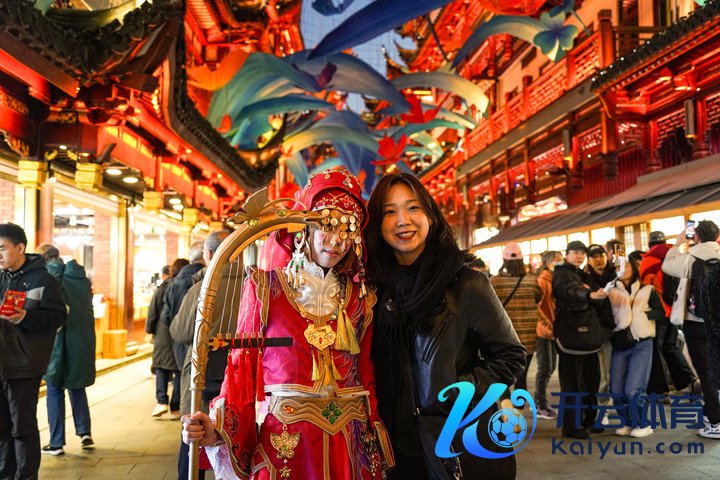 11月30日,来自韩国的搭客(右)在上海豫园商城与游戏变装装束者合影。新华社发(谢鑫 摄)