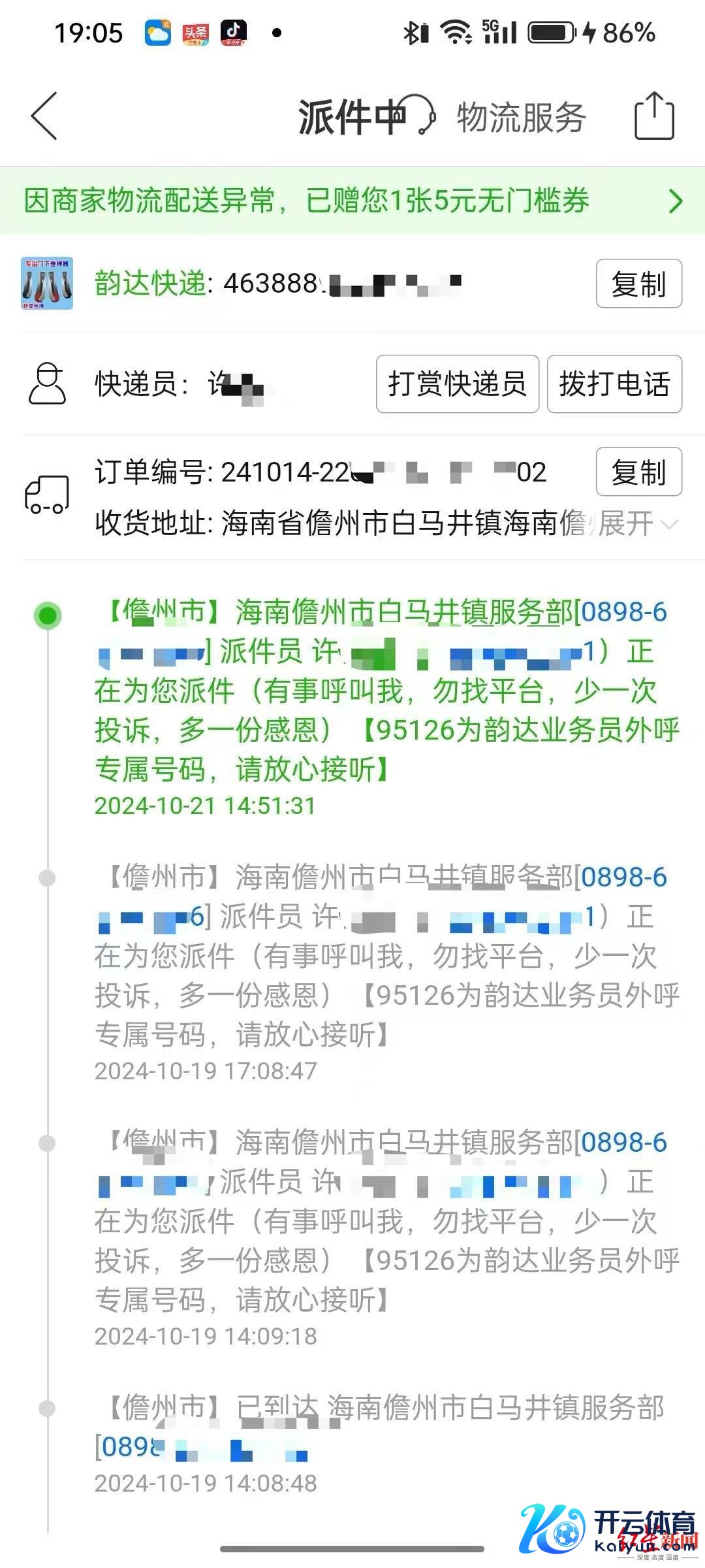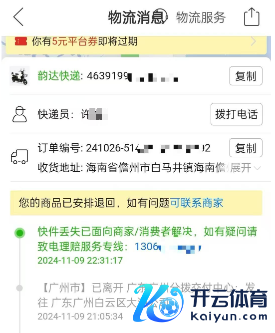 在李先生提供的多张物流信息截图里,记者看到,2024年11月本领,李先生购买的多个网购包裹最终皆被送还,其中一条波及韵达快递的送还信息涌现“因商家物发配送极度,已赠1张5元无门槛券”。