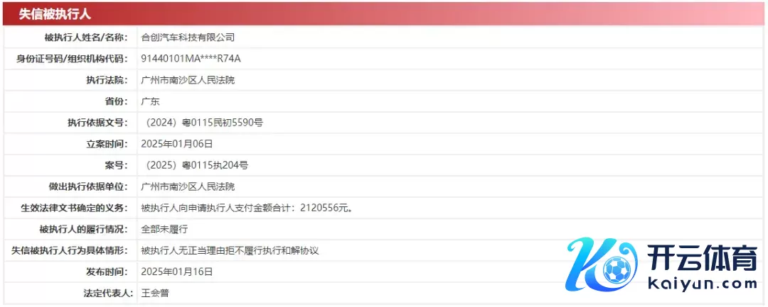 中国实行信息公开网闪现,1月16日,合创汽车科技有限公司因被实行东说念主无刚直事理拒不实践实行息争条约,被广州市南沙区东说念主民法院列为失信被实行东说念主,触及做事合同纠纷案件,实践情况为一起未实践。生鉴戒律文书细看法义务闪现,被实行东说念主向央求实行东说念主支付金额悉数2120556元。