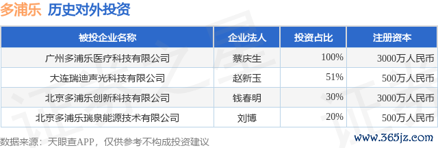 本站音问,凭证天眼查APP显现,多浦乐(301528.SZ)新增沿途对外投资事件,被投资公司为北京多浦乐改动科技有限公司,法定代表东谈主钱春明,投资占比为30%。该公司从事仪器仪容制造业,注册老本为3000万东谈主民币。现在,多浦乐共存在对外投资4项,详见下表:
