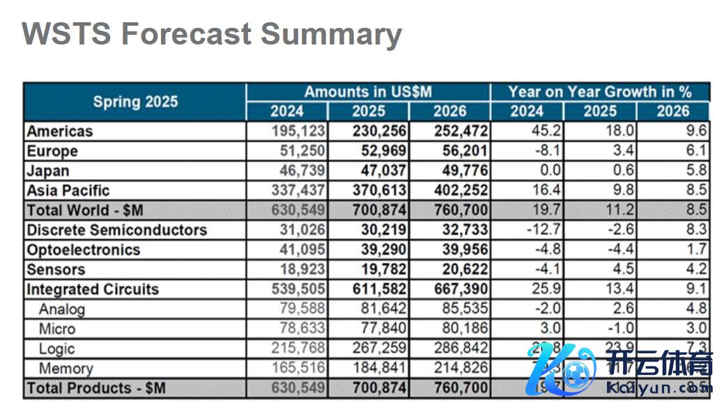 WSTS估计继2024年强壮反弹之后,2025年寰球半导体市集将增长11.2%,总价值将达到7009亿好意思元,主要收获于GPU主导的逻辑芯片范畴以及HBM主导的存储范畴捏续强壮的势头,估计这两个范畴王人将末端强壮的两位数增长,这收获于东谈主工智能推理系统、云计较基础措施和前沿花消电子等范畴的捏续强壮需求。